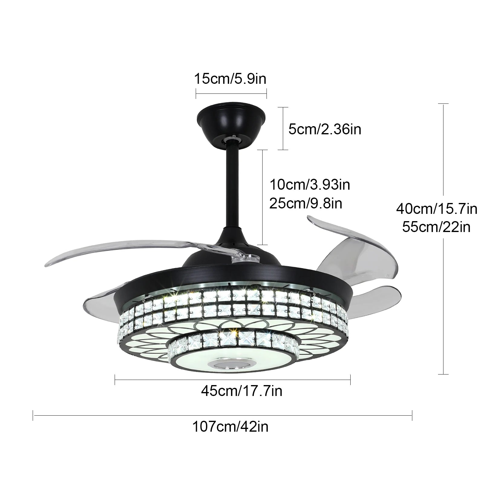 Introducing the ultimate combination of style and functionality - the LED Retractable Bluetooth Music Speaker 7-Color Crystal Modern Ceiling Fan. This stunning piece from Bright Bulbs LED is the perfect addition to any modern home decor. With its sleek design and 7-color crystal feature, this ceiling fan will not only keep you cool, but also add a touch of elegance to any room.But that's not all, this ceiling fan also comes equipped with a retractable Bluetooth music speaker, allowing you to enjoy your favorite tunes while relaxing in the comfort of your own home. The fan also includes a remote control for easy operation and weighs only 9.34kg, making it easy to install.Don't settle for a boring and basic ceiling fan, upgrade to the LED Retractable Bluetooth Music Speaker 7-Color Crystal Modern Ceiling Fan and elevate your home decor to the next level. Order now from Bright Bulbs LED and experience the perfect blend of style and functionality.