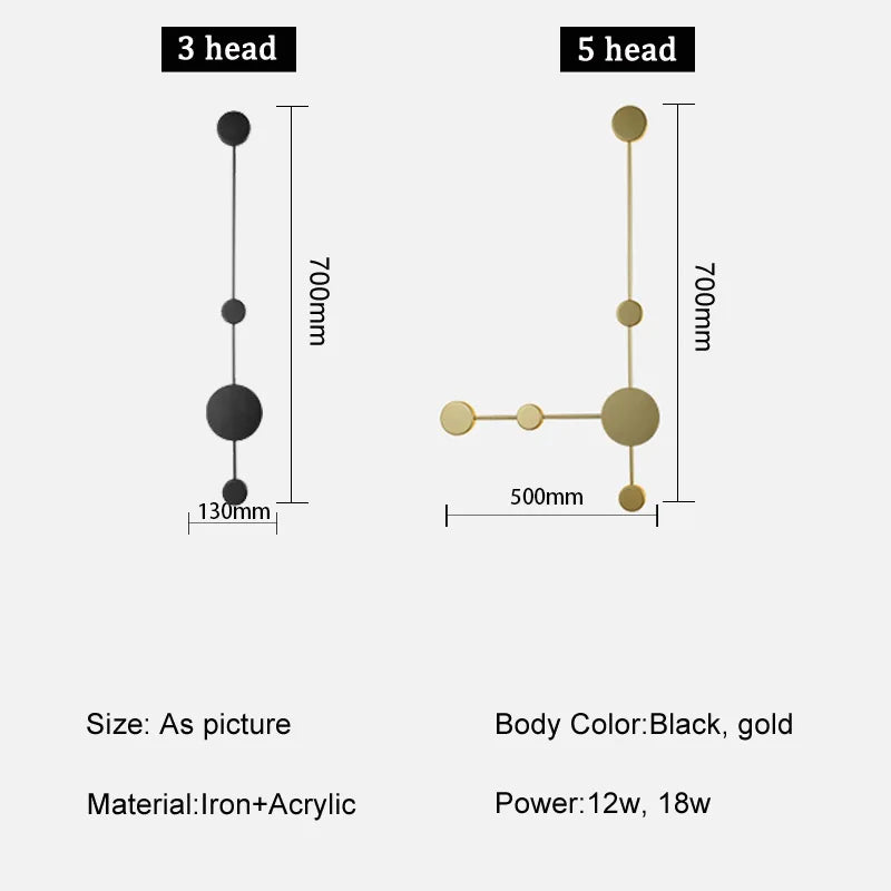 The LED Connect dot Sconce light is a modern and stylish addition to any living space. With its sleek design and warm white LED bulbs, this wall lamp is perfect for creating a cozy and inviting atmosphere. It is made of high-quality metal and acrylic materials, ensuring durability and longevity. This sconce light is easy to install and can be mounted on any wall surface. It features a knob switch for easy on and off control. With a lighting area of 3-5 square meters, it is suitable for various applications such as the kitchen, dining room, bedroom, foyer, and study. Available in black and gold, this LED wall lamp is a versatile and customizable lighting solution.